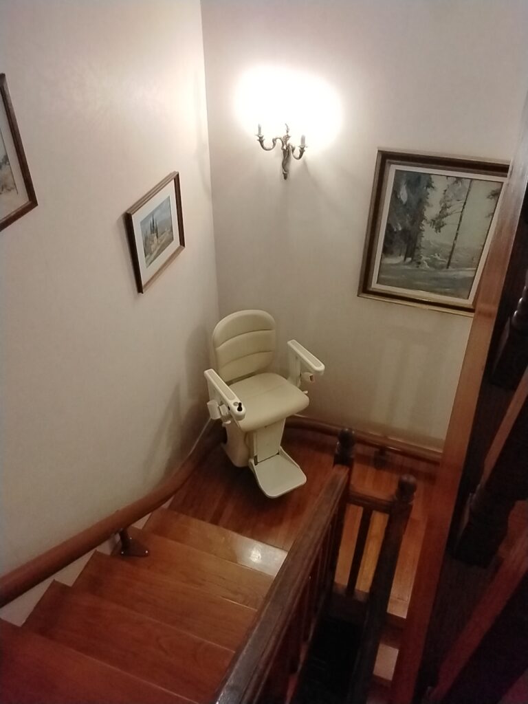 Installation à Limoges (87) d’un monte-escalier Courbe Handicare avec siège Elégance sur escalier bois avec palier intermédiaire