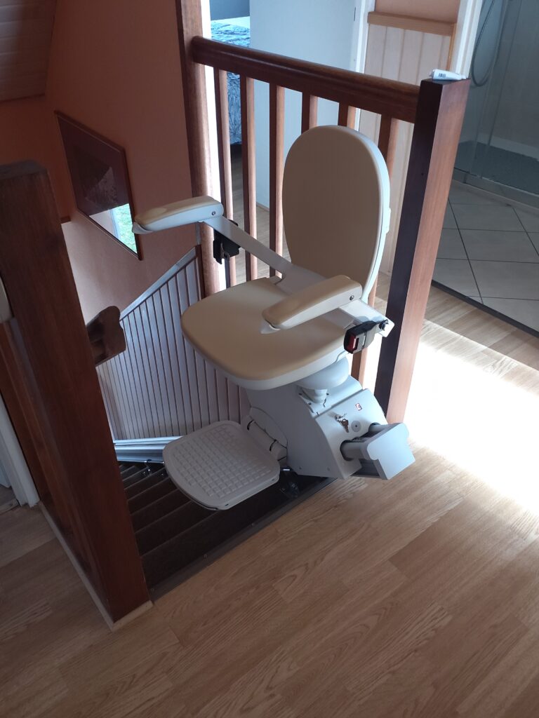 Nouvelle installation d’un monte escalier droit M1100 Handicare à Panazol (87) à côté de Limoges sur un escalier bois.Pour éviter d’avoir un rail qui dépasse sur le palier haut, nous avons utilisé l’option « zéro intrusion » qui décale le rail dans l’escalier. De ce fait, arrivé en haut le repose pied est à hauteur de la dernière marche et l’accoudoir ne dépasse pas du poteau de la rambarde. Une fois pivoté électriquement, notre cliente peut sortir du siège en toute sécurité. Le siège stationner en bas et le rail ne gênent pas le passage dans l’escalier.Merci à notre cliente pour sa confiance.Si vous connaissez parmi vos proches ou amis, une personne pour qui ses escaliers représentent un obstacle, pensez à elle, contactez-nous ! -